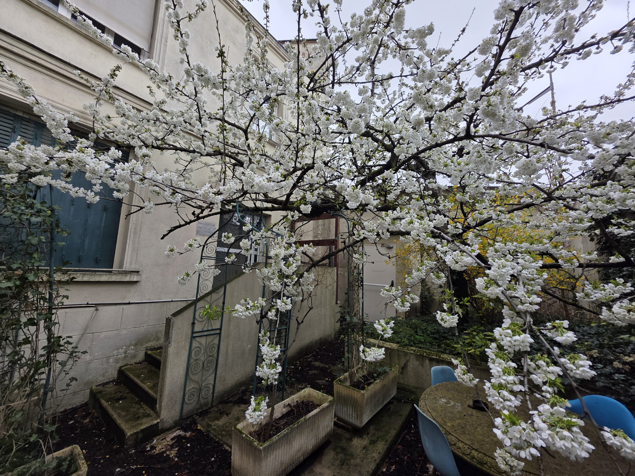 - Exposition agréable, cerisier, treillages et bacs plantés